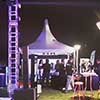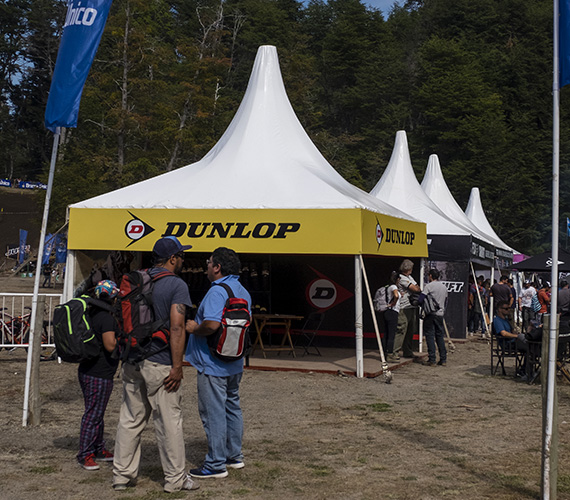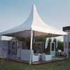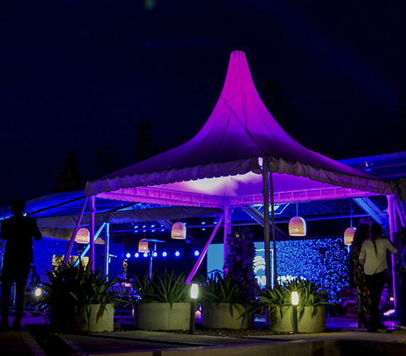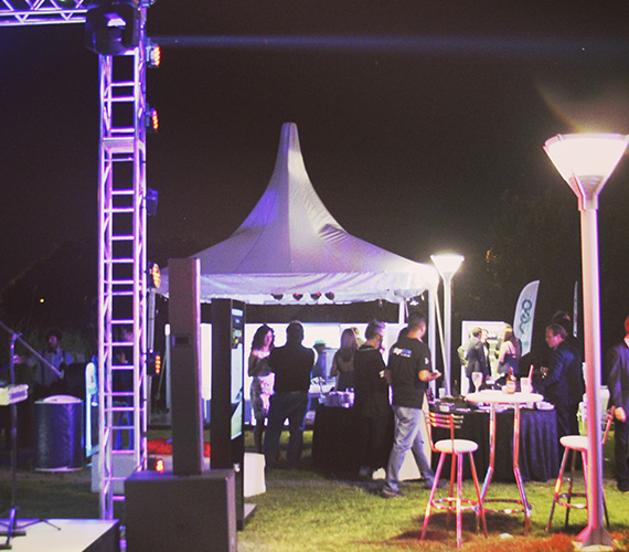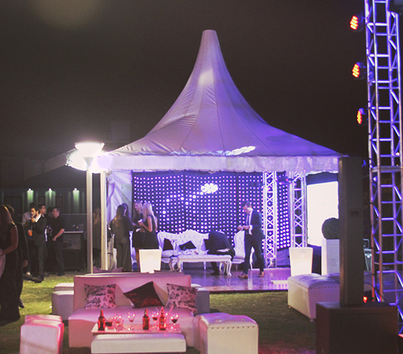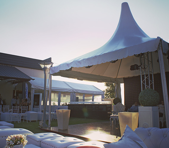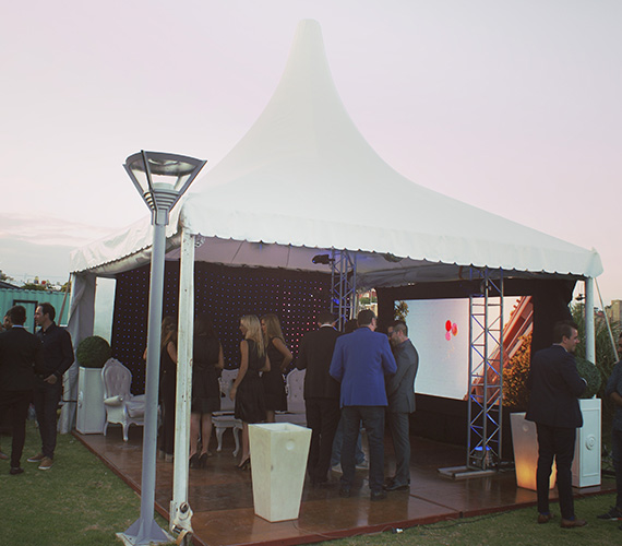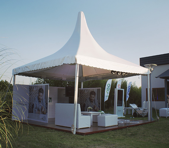 De 5 x 5 m o 6 x 6 m. Estructura de hierro con lona blanca blackout ignífuga certificada por INTI. Sus laterales son rebatibles, ciegos o con ventana.