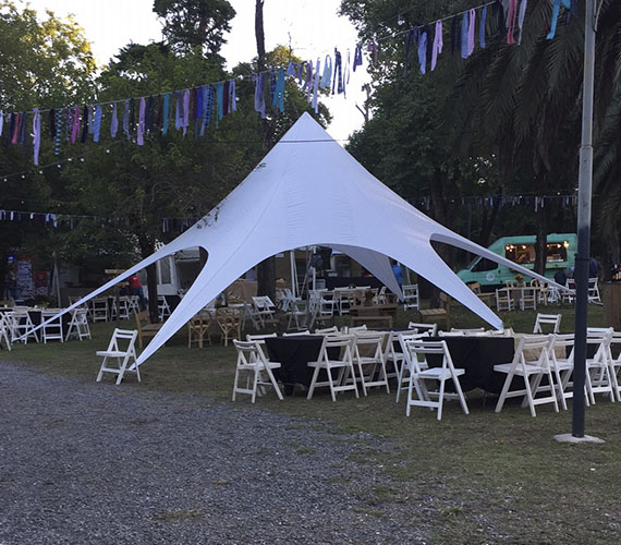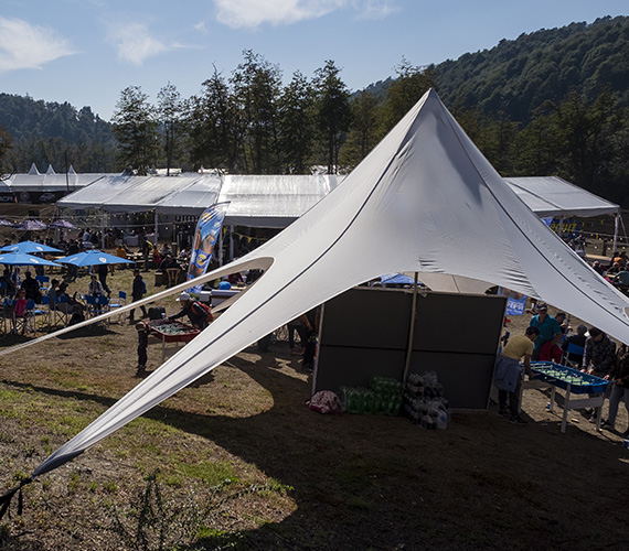 Su material es cordura importada. Posee una columna central de 5m. Radio de 13 m. Capacidad 44 personas sentadas, 70 de pie. Altura de 5,10 m altura de paso 2,20 m.