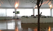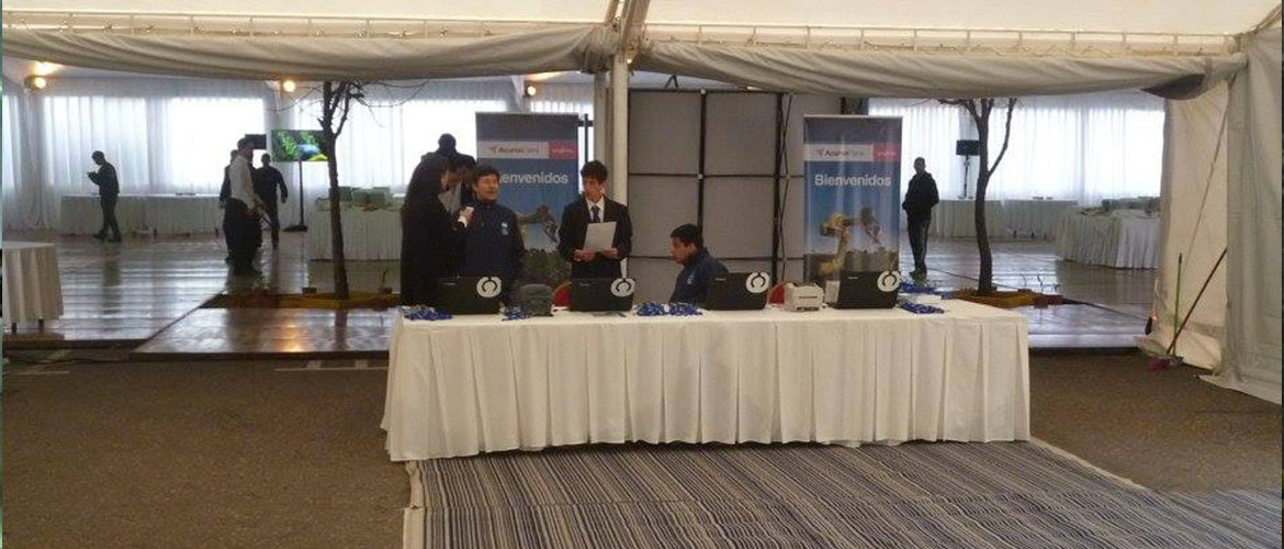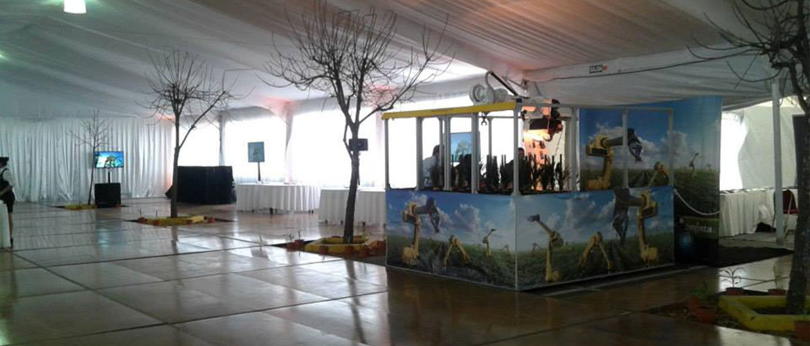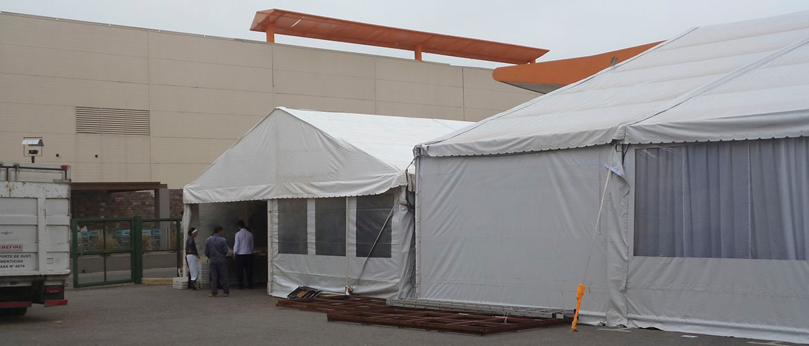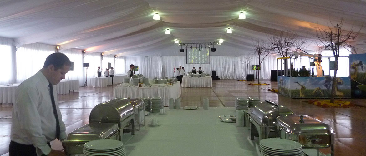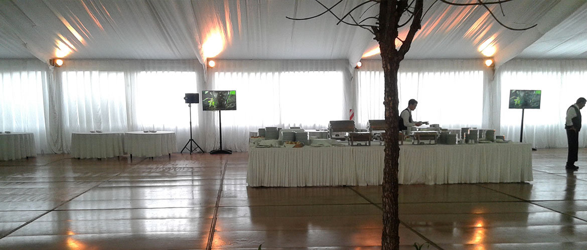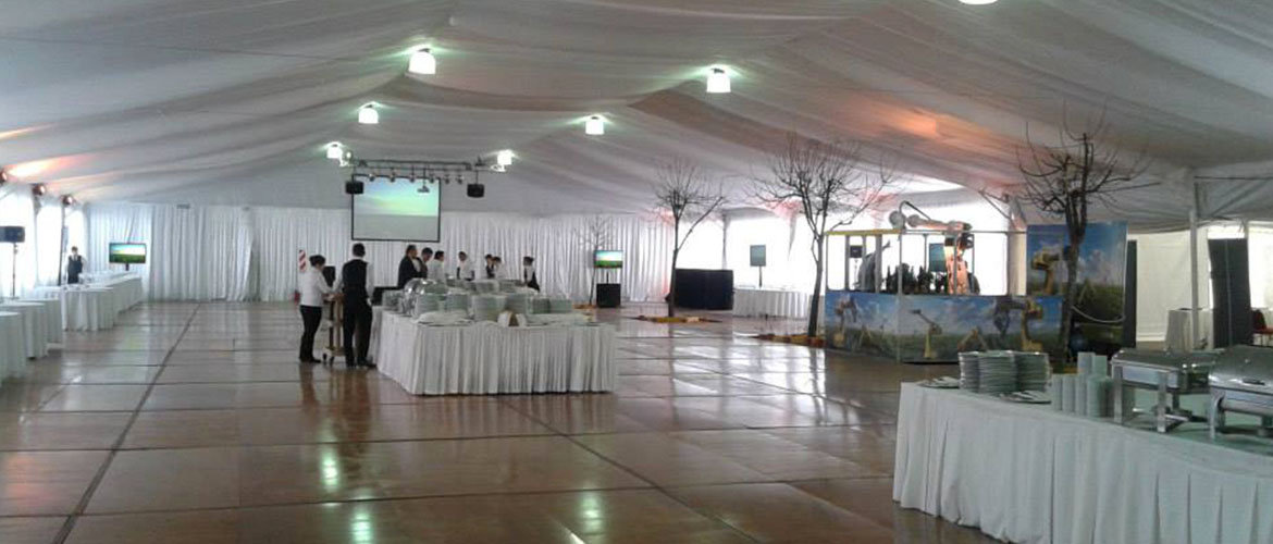 Carpa principal 20 x 45 m con piso, entelado, cielorraso y cortinado. Carpa cocina con piso. Carpa 12 x 10 m, conexión foyer hotel con carpa, alfombra, carpa beduina 5 x 5 m de acreditaciones y escenario.