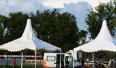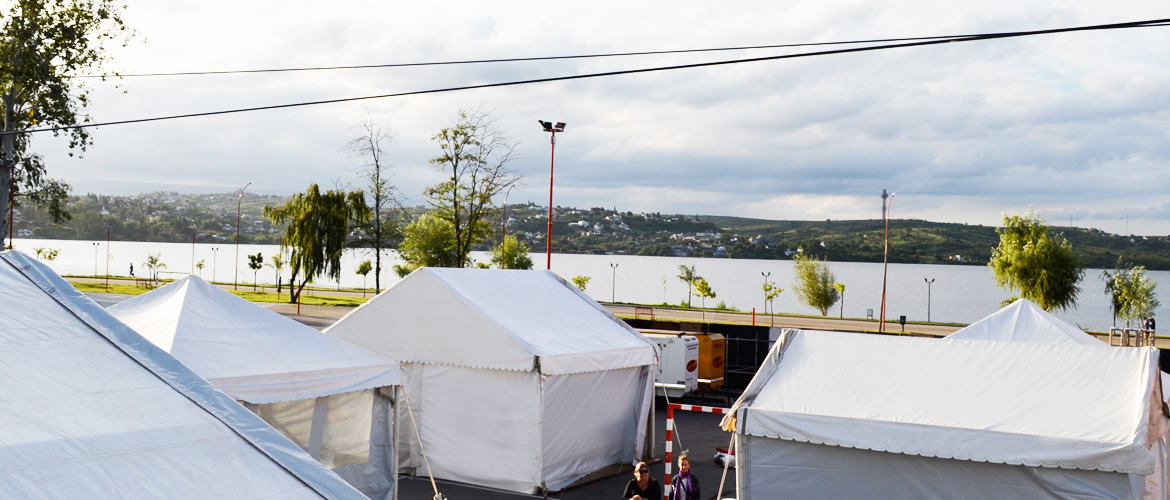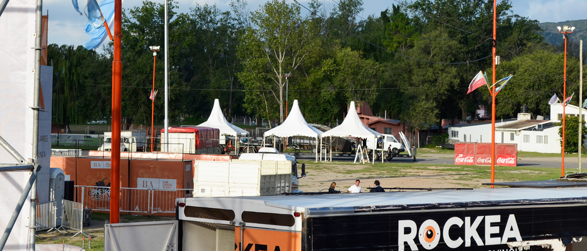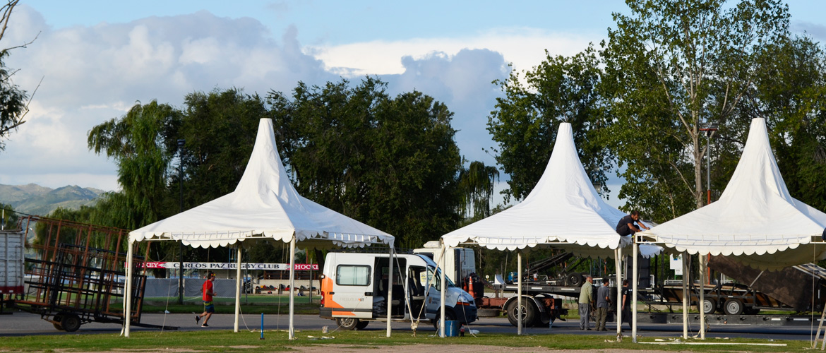 Carpa Protocolo 9 x 5 m con piso, Carpas Camarines 5 x 5 m con piso, carpas para producción 6 x 5 m con piso, carpas para catering 5 x 5 m con piso. Aire acondicionado, mobiliario, equipamiento para camarines y Juegos de living.